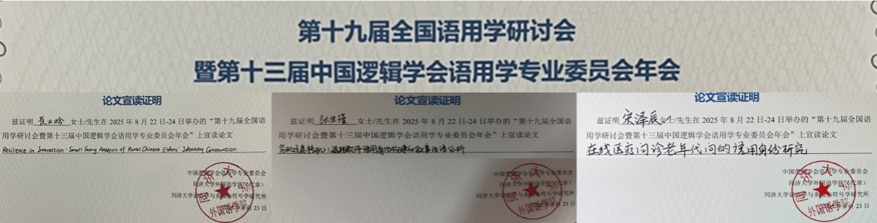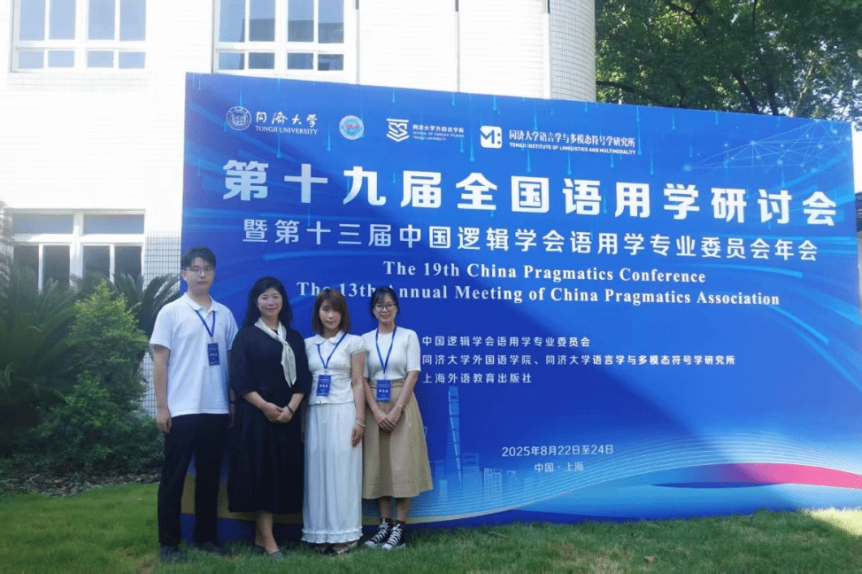 2025年8月22—24日,第十九届全国语用学研讨会暨第十三届中国逻辑学会语用学专业委员会年会于同济大学成功召开。大会以“面向社会变化的语用学创新研究”为主题,汇聚语用学及相关交叉学科400余位专家学者。我们朱冬怡副教授带领2024级硕士生崔云晗、张世瑾、宋泽辰一行四人赴沪参会,共襄学术盛举。