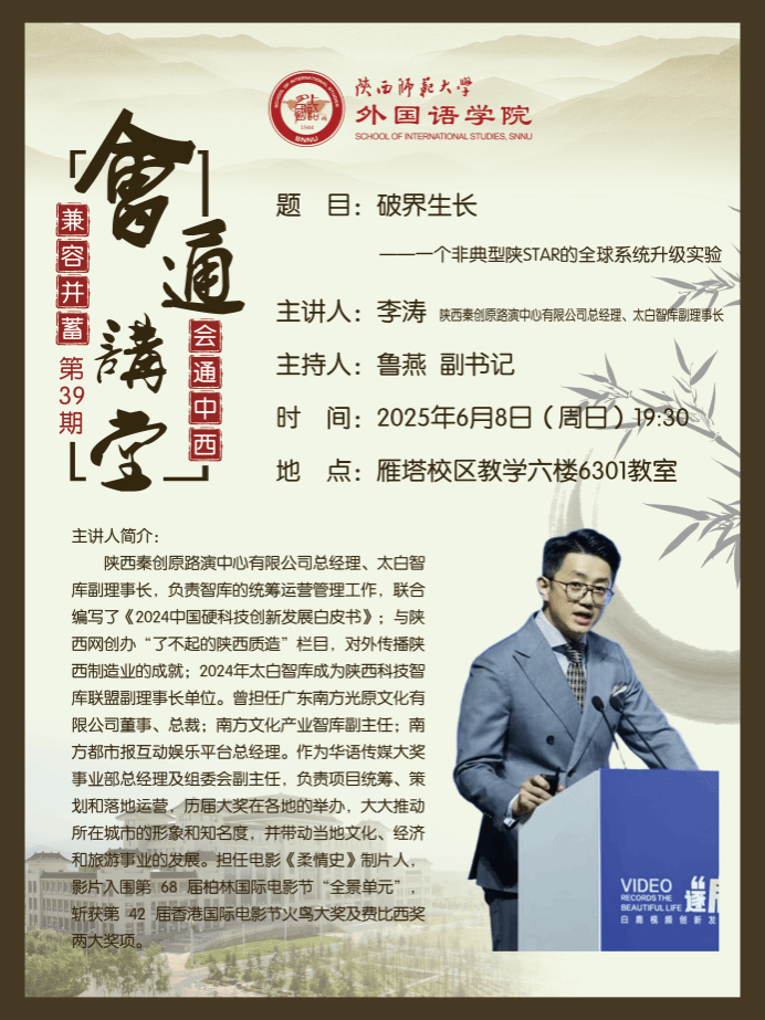 为探索外语类专业人才的跨界发展路径、提升复合型竞争力,2025年6月8日晚19:30,我们在6301教室举办第39期会通讲堂。本期讲座特邀陕西秦创原路演中心总经理、太白智库副理事长李涛担任主讲嘉宾,以《破界生长——一个非典型陕STAR的全球系统升级实验》为主题展开分享,70余名学生参与。讲座由太阳成集团tyc539党委副书记鲁燕主持。