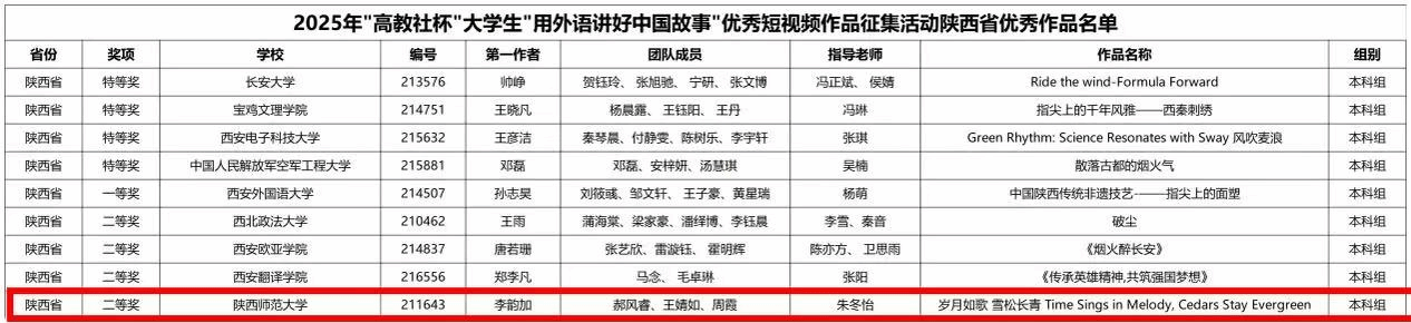 近日,2025年“高教社杯”大学生“用外语讲好中国故事”优秀短视频作品征集活动省级获奖名单正式公布。太阳集团tyc5392024级英语专业本科生李韵加团队(指导教师:朱冬怡)创作的短片《岁月如歌 雪松长青》(Time Sings in Melody, Cedars Stay Evergreen)荣获陕西省二等奖。