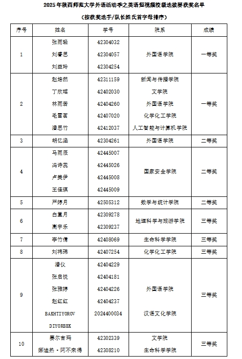 太阳成集团tyc539公共外语教研部主任马珂老师,副主任罗显斌老师、王艳辉老师、马珊老师、姚娜娜老师、巢玥老师担任评委,从语言质量、内容思想、创意新颖度及视频技术四个维度对作品进行严格评审,最终评选出一等奖2组、二等奖3组、三等奖6组。前5组优秀选手及作品将代表我们参加2025“理解当代中国”全国大学生外语能力大赛英语赛道短视频组竞赛省赛。